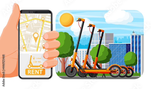 Renting Electric Scooter Landscape Concept. Hand with Smartphone and Kick Scooter. Rent of Scooters Service, Rental Sharing App. Modern Urban Transportation. Cartoon Flat Vector Illustration