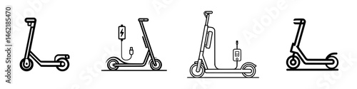 Iconic vector illustration depicting various electric scooters in different states of use and charging