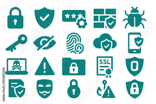 A Collection of Security Icons in Teal Representing Various Aspects of Cybersecurity and Data Protection Including Encryption Firewalls Privacy and Threat Detection Against a White