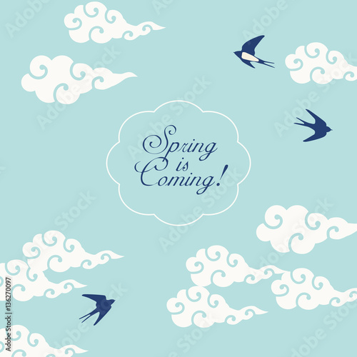 Cute pattern card with flying birds and lettering - Spring is in the air. Animal print design for greeting card, banners and posters. Vector hand-drawn background with cloud frame and birds.