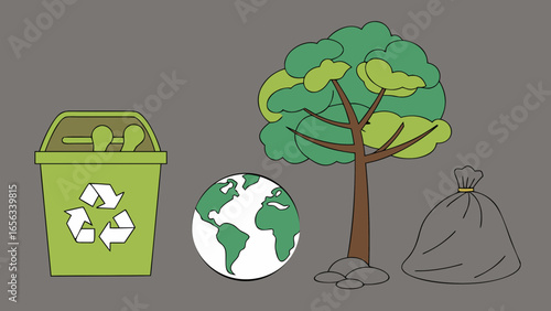 Green recycle bin icon set for waste management and ecology. Vector collection of trash can, garbage bag, and recycling symbols. Environmental conservation and sustainability concept.