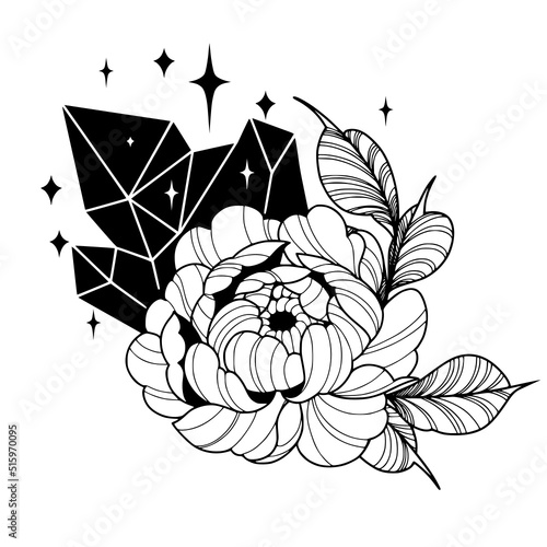 Outline psychedelic mystic crescent symbol in 70s art style. Retro groovy sketch element of moon with flowers and leaves. Pagan drawing. Vintage boho illustration