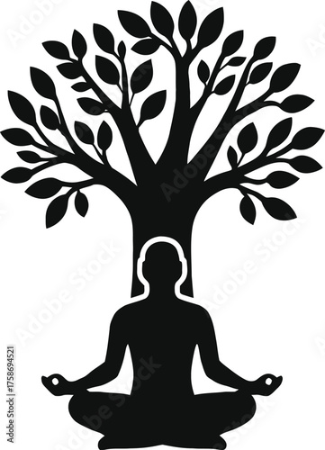 Silhouette of person in yoga pose within a stylized tree with leaves meditation