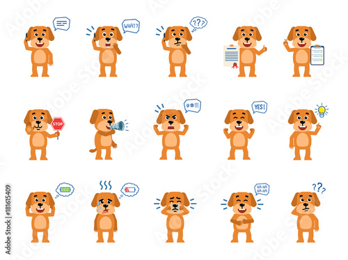 Set of funny yellow dog characters showing different actions. Cheerful dog talking on phone, thinking, holding stop sign, loudspeaker and showing other actions. Flat style vector illustration