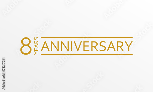 8 years anniversary logo template on gold background. 8th celebrating golden numbers with red ribbon vector and confetti isolated design elements