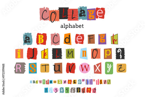 Collage font colorful cutout letters, cut pieces paper alphabet.Cuts from newspaper, anonymous message style. Vector set