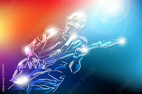 Energetic rock guitarist silhouette performing live concert poses with electric guitar, dynamic stage movement, music performance illustration for creative vector design