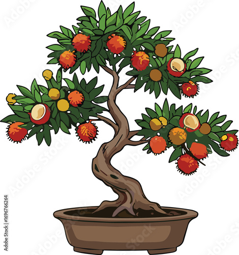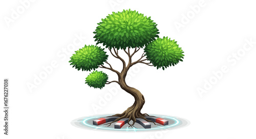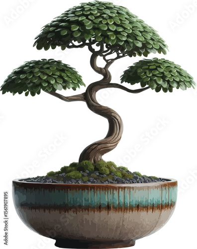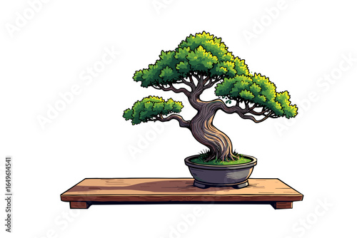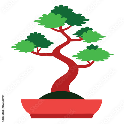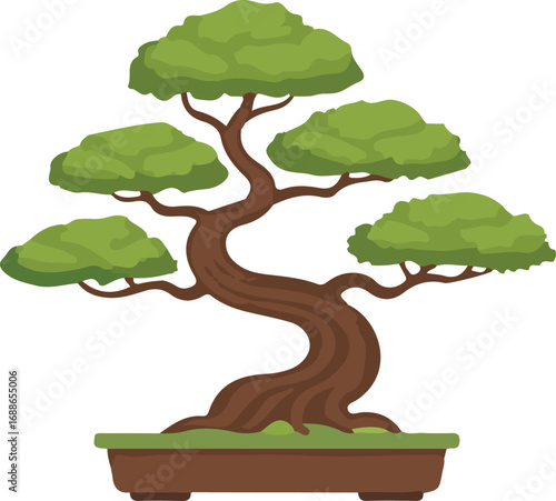 A cartoon bonsai tree with green foliage and a brown pot on a white background