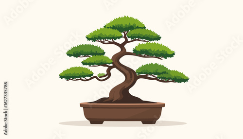 Beautiful bonsai tree illustration with pink cherry blossom flowers, green foliage artwork, seasonal nature design, Japanese garden landscape, oriental style