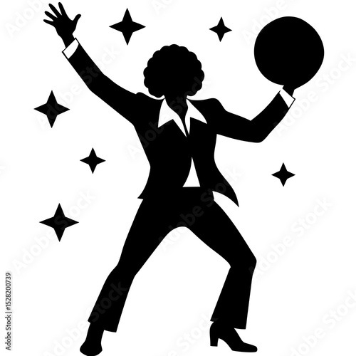 Black silhouette icons of disco dancers in dynamic poses wearing flared pants, capturing 1970s dance style and retro movement