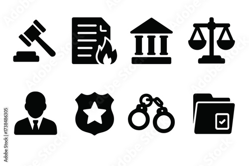 Law & Order Icons. Law & Order. Solid icons set of Law & Order: hand holding document, gavel, police badge, courthouse, handcuffs, legal scale, magnifying