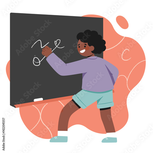 Illustration of classroom scene with students at blackboard and learning related objects around