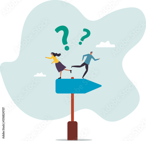 Confused businessman facing career choices and uncertain business goals. Decision making dilemma, crossroads in professional path, growth opportunities, risk management. Vector illustration concept