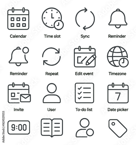 Essential minimalist icons calendar, checklist, alarm, notification, and message bubble