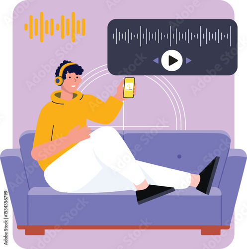 A continuous line drawing illustration of a person recording a podcast with headphones and microphone Vector, illustration