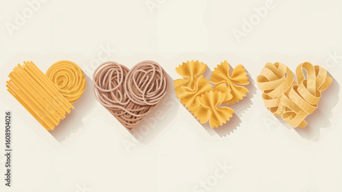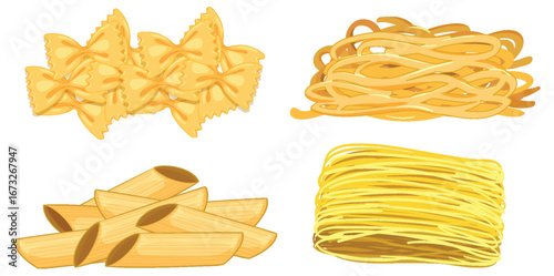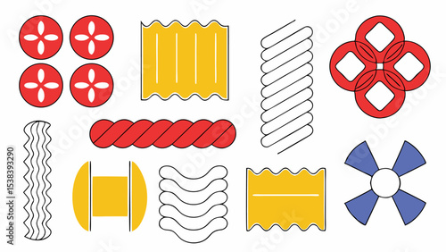 Set of various pasta shapes, ideal for cooking blogs, restaurant menus, or food packaging.