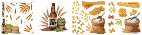 Illustration Featuring Craft Brew Ingredients, Flour, and Various Pasta Shapes on White Background