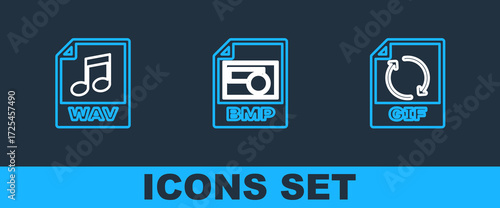 Black GIF file document. Download gif button icon isolated on dark blue background. GIF file symbol. Set abstract banner with liquid shapes. Vector Illustration