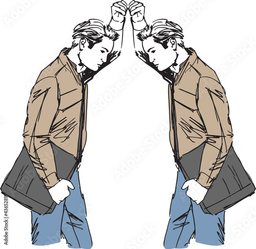 sketch of Man takes a look at himself in the mirror. Vector illu
