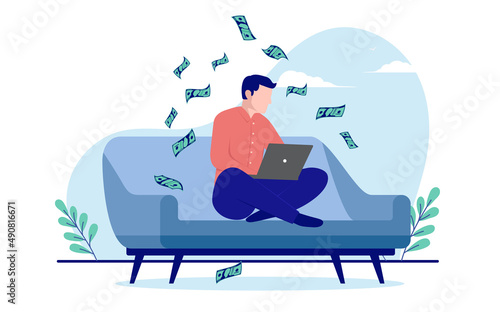 Making money online from home - Man sitting with computer in couch making income. Flat design vector illustration with white background