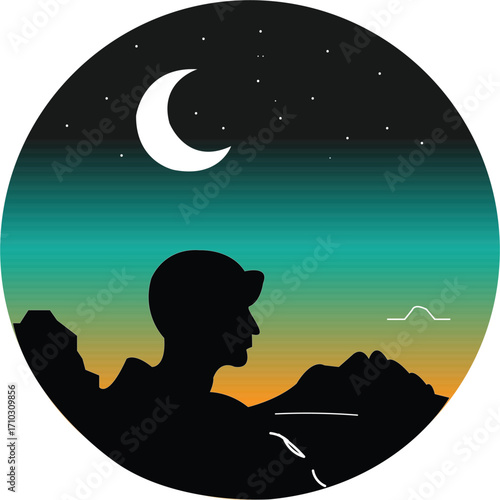 Silhouette of a man sitting by the ocean shore at night with the moon reflecting on calm water