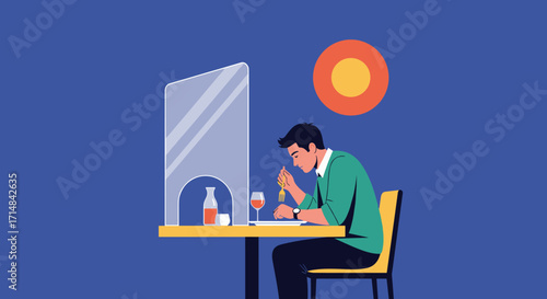 A man enjoys a meal alone at a table with a protective barrier and a glass of wine.