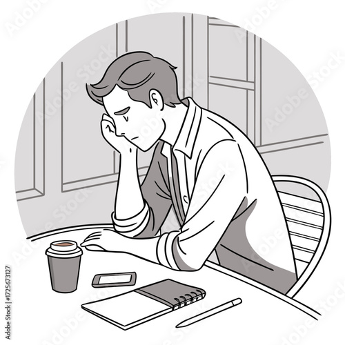 Vector illustration of a sad man sitting alone at a table with a coffee cup, notebook, and phone. Ideal for concepts of stress, depression, loneliness, burnout, overthinking, and emotional struggles