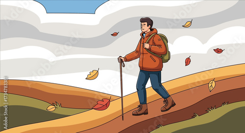 A man hiking in autumn with backpack and hiking pole on a trail in landscape