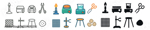 Laboratory equipment icons, microscope, test tubes, flasks, bunsen burner, science research and chemistry concepts
