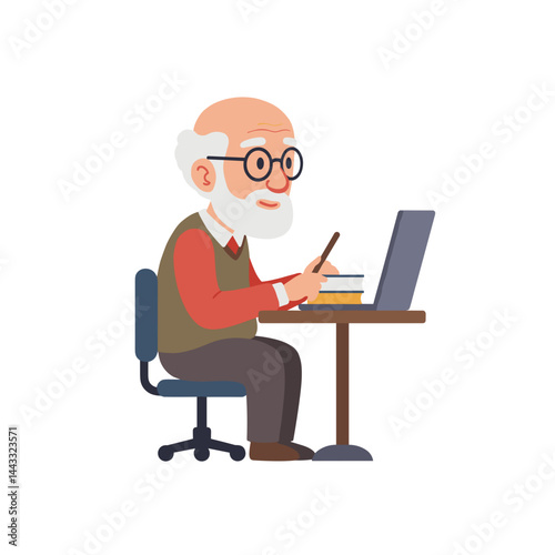 3D Cartoon Elderly Man with Cane Bald Head and White Beard.