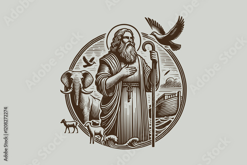 Biblical scene. Old testament. Noah ark with wild animals. Bearded man in tunic gathers fauna characters on ship. Wooden boat. Christian religion. Gospel legend. Garish vector concept