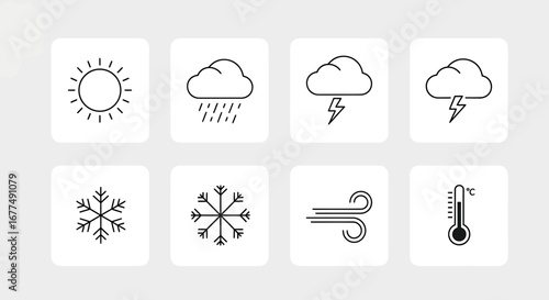 Line Art Sun Cloud Rain and Snowflake Weather Icons.