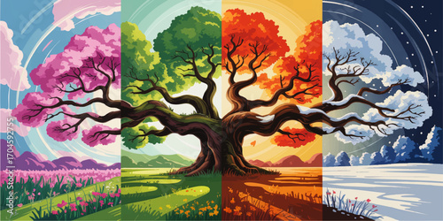 4 seasons. Winter snowy background. Summer tropical island, beach landscape. Spring forest nature with the sun. Autumn graphic rainy landscape. Different weather hot and cold. Vector poster collection