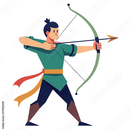 An archer in a focused stance is drawing a bow, rendered as a clean 2D flat vector illustration with solid colors in a graphic design style, isolated on white.