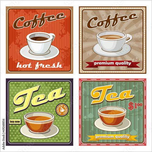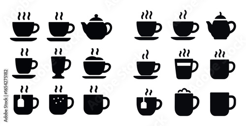 Collection of coffee and tea icons featuring cups, pots, and beans