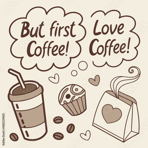 Two coffee cups with steam and coffee beans in a simple line drawing style