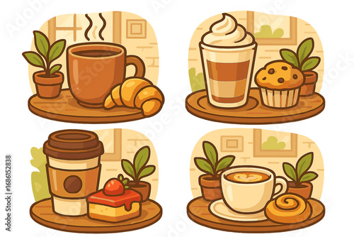Assortment of Coffee Cups Drinks and Food Icons in a Row.