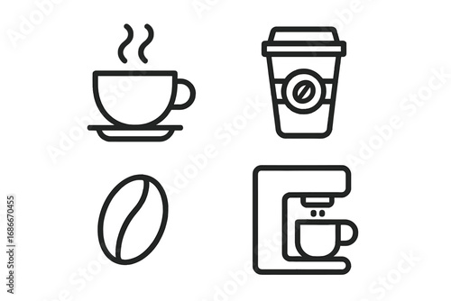 Coffee brewing icons: espresso machine, mug, grinder, beans, and teapot