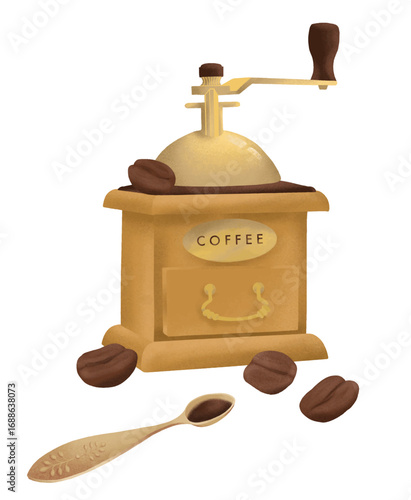 Isometric Manual coffee grinder icon isolated on orange and blue background. Vector