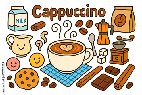 Various coffee drinks espresso cappuccino latte and moka pot with coffee beans and cookie illustration