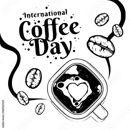 Black ink splatter coffee illustration set featuring cups, beans, and kettle for art projects