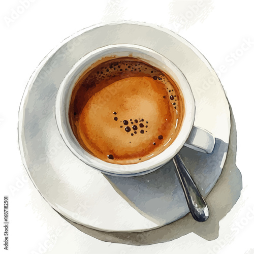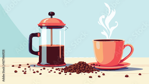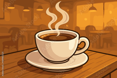 Illustration of a steaming hot cup of coffee with a few coffee beans on the table near the cup