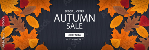 Autumn sale banner template with lettering. Background layout decorate with red, yellow and brown leaves for shop. Modern realistic design. Beautiful wallpaper. Flat style vector illustration.