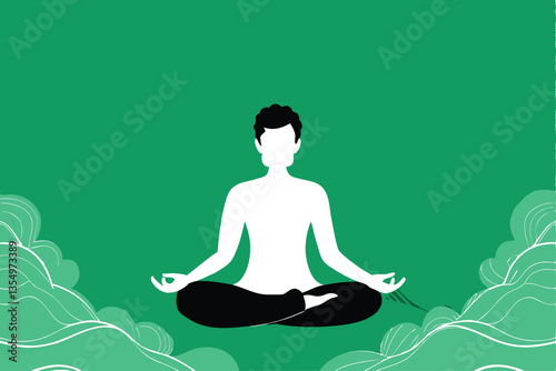 Illustration teinte bleue et verte sur fond blanc, silhouette féminine assise en train de méditer en position du Lotus, zen, yoga, méditation.