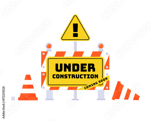 Under Construction stop barrier clipart illustration, Yellow warning sign with a triangle symbol on an under construction background representing danger and caution at a construction site