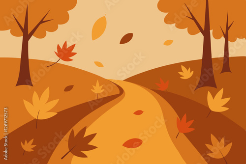 Beautiful autumn landscape vector, forest trees, golden meadows, winding path, warm sunset light, tranquil nature scene, fall colors, peaceful view, outdoor travel background, seasonal beauty