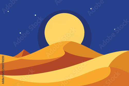 A serene and minimalist desert landscape with rolling sand dunes under a warm, setting sun in a flat vector style. vector illustration