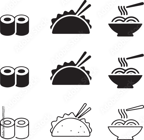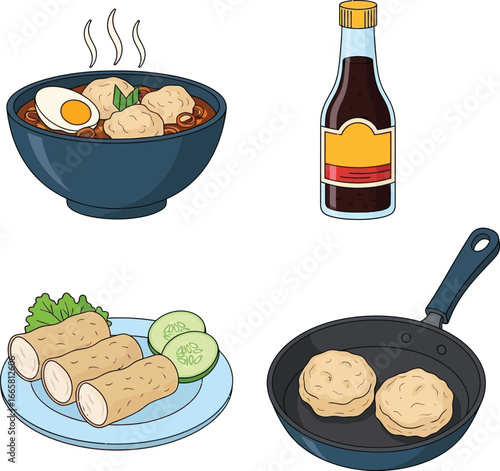 Illustration of Asian dishes: spring rolls, takoyaki, sushi, and hot pot, vector set