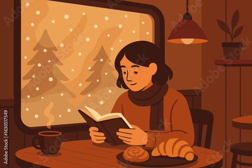 Holiday Coffee Cup on Festive Red Tablecloth with Holly and Snowflakes Illustration