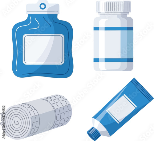 Black silhouette icons of towel, bowl with stars, notepad, and cup of hot drink on white background